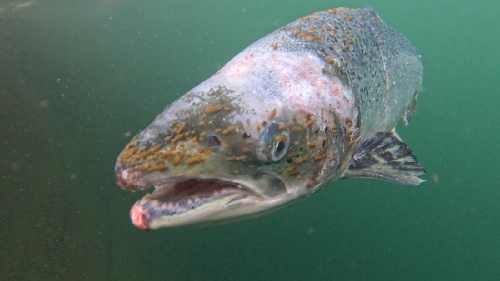 Photo of salmon covered in lice at Aird